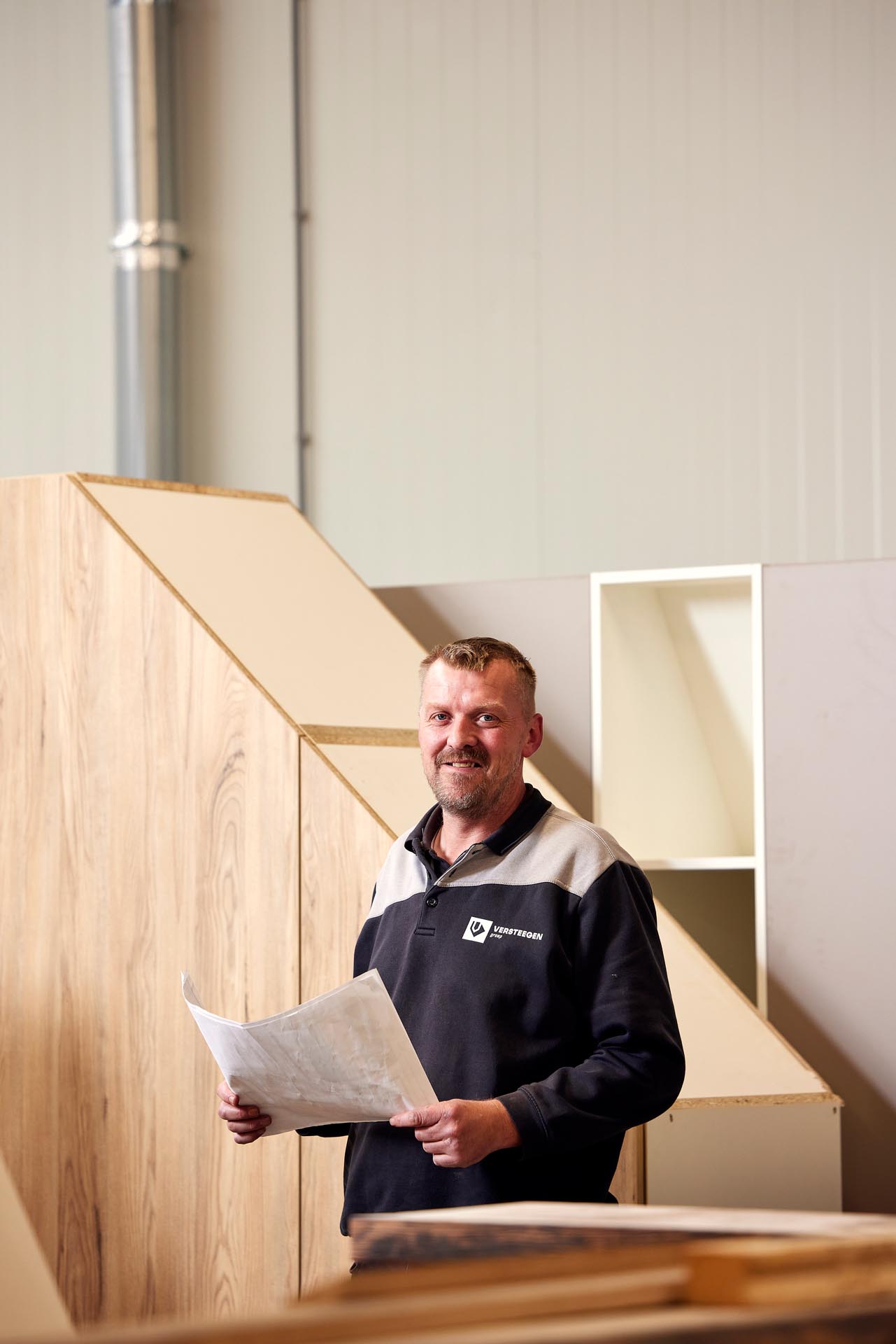 Die groeiende vraag leidde tot de oprichting van Versteegen Interieurbouw. In de werkplaats worden meubels en interieuronderdelen met grote zorg en precisie voorbereid. Alles wordt op maat gemaakt, zodat het exact aansluit op het ontwerp, de functie en de ruimte. Kwaliteit staat daarbij altijd voorop. “Mensen willen iets dat klopt,” legt Rudi uit. “Een kast die echt past. Een keuken die is afgestemd op hoe iemand leeft. En dat moet gewoon goed gemaakt zijn; stevig en netjes afgewerkt. Daarom beginnen we altijd met een goed gesprek. Je luistert naar iemands wensen en vertaalt dat naar een ontwerp dat praktisch is én er mooi uitziet. Op die manier vormen interieur en bouw samen één geheel.”