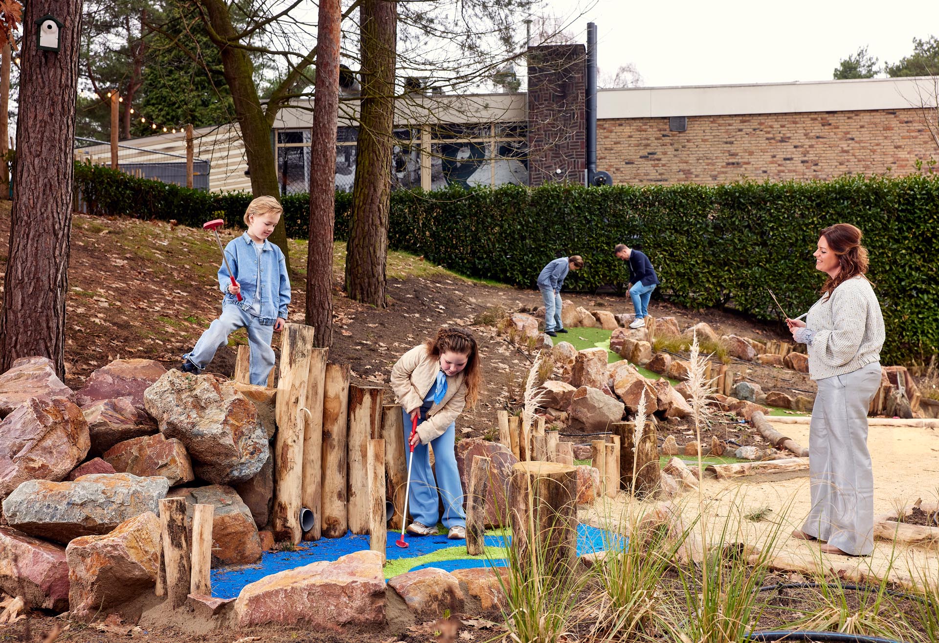 Even rennen, even bewegen en natuurlijk de gloednieuw aangelegde minigolfbaan uitproberen. Rianne kijkt hen lachend na. “Ze hebben altijd energie. Lukas kan zich uren vermaken met dj’en, maar staat net zo lief op het voetbalveld. Hannah zingt bij Mekiko en danst bij MD Meijel. En Julius? Die is ook het liefst met een bal bezig.”